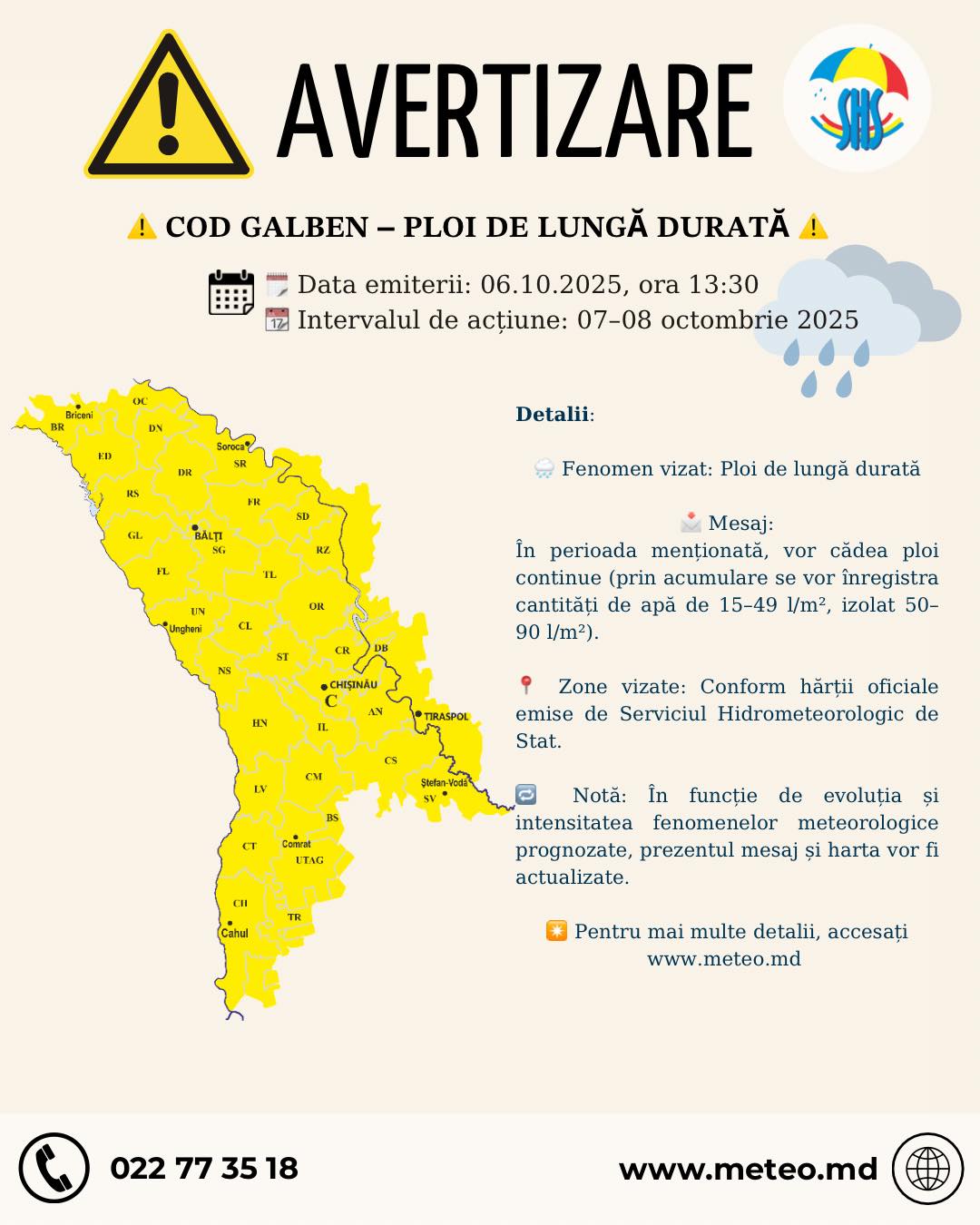 Serviciul Hidrometeorologic de Stat a emis, luni, o avertizare Cod Galben de ploi de lungă pe întreg teritoriul Republicii Moldova pentru zilele de 7 și 8 octombrie.