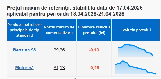 Astfel, benzina se ieftinește cu 0,13 lei și va costa 29,26 lei per litru, în timp ce motorina înregistrează o scădere de 0,29 lei, ajungând la prețul de 31,13 lei per litru.